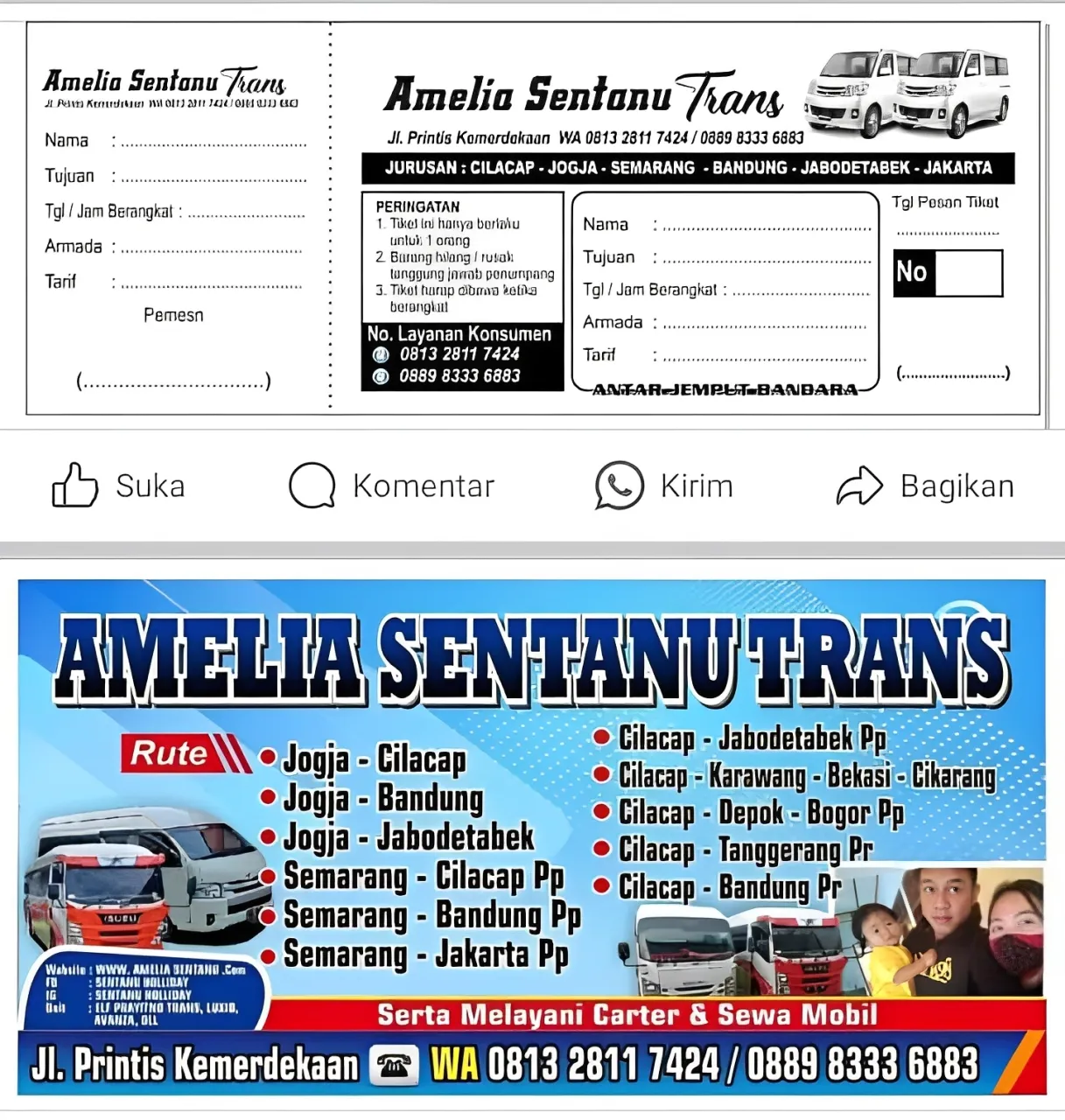 Amelia Sentanu Trans adalah layanan transportasi profesional yang telah melayani berbagai rute utama seperti Cilacap, Jogja, Semarang, Bandung, Jabodetabek, dan Jakarta, serta menyediakan layanan antar-jemput bandara, carter, dan sewa mobil.